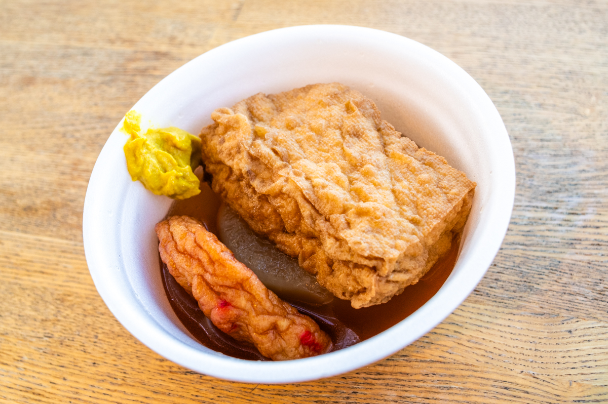 9つの種類から3つを選ぶシステム。愛知らしいメニュー「味噌おでん」にすると30円アップで甘辛い味噌をかけてくれる